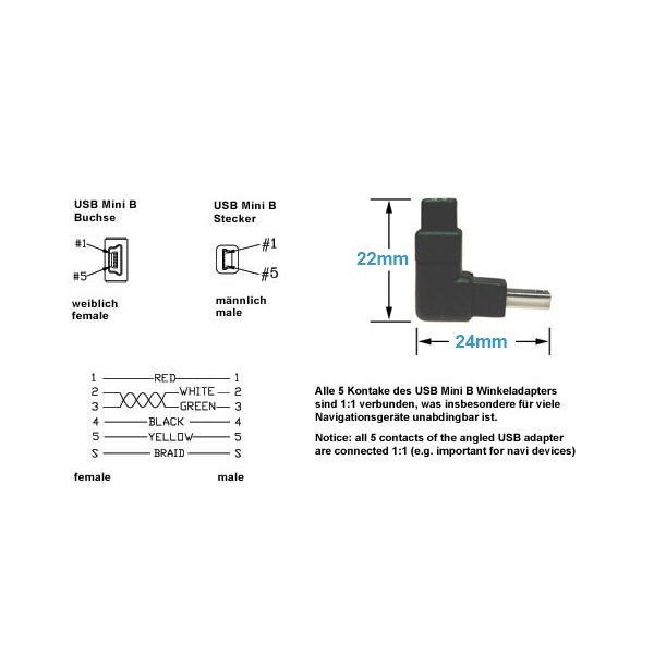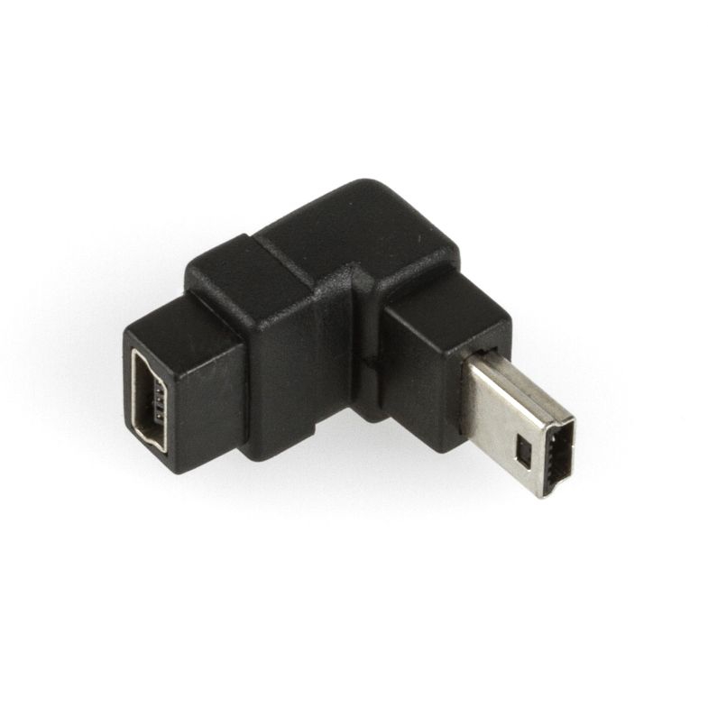 Adaptateur USB 2.0 Mini B mâle-femelle coudé 90° vers l'ARRIÈRE, les 5 broches sont connectées 1:1 (par exemple, recommandé pour les appareils de navigation)