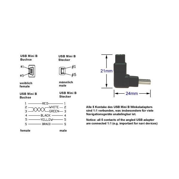 Adaptateur USB Mini B coudé à 90° vers l'avant 5 broches 1 vers 1
