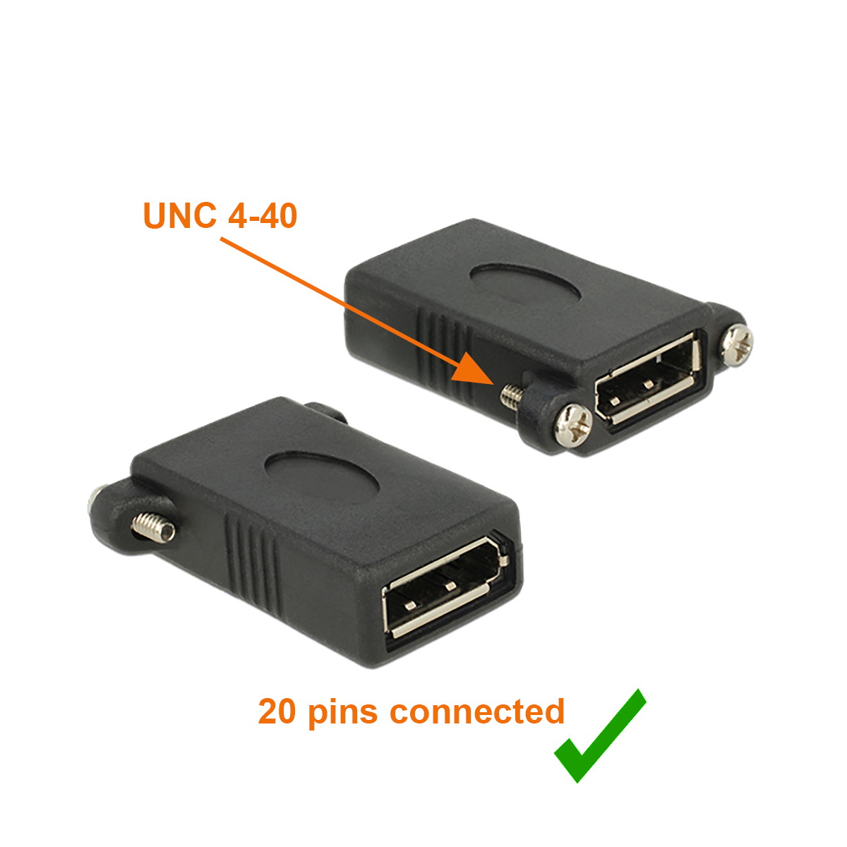 This DisplayPort adapter by can be used to extend a DisplayPort connection and to connect various devices. The female port can be attached with two UNC 4-40 screws, e.g. to a slot bracket, a cable duct or an enclosure with the corresponding opening.