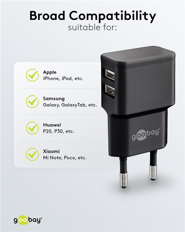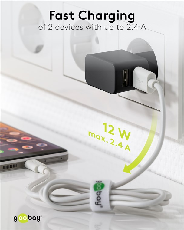 Bloc d'alimentation 2x USB A femelle, sortie: 5V max. 2400mA, entrée: 100-240V / 50-60Hz, noir