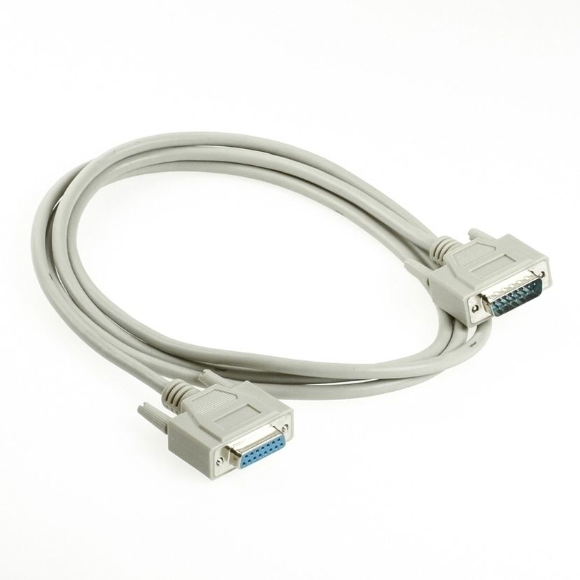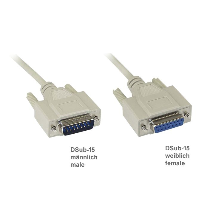 Câble DB15 mâle vers femelle (DSub15 m/f), entièrement blindé, 15 broches, connexion 1-1, 2-2, 3-3 ... 15-15, couleur: grise, connecteurs entièrement moulés avec vis de serrage, longueur 1m