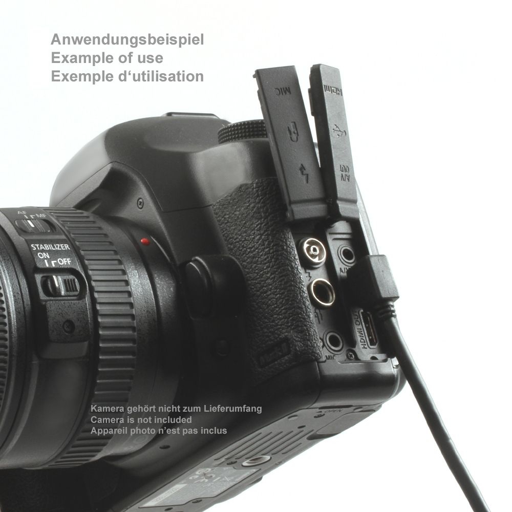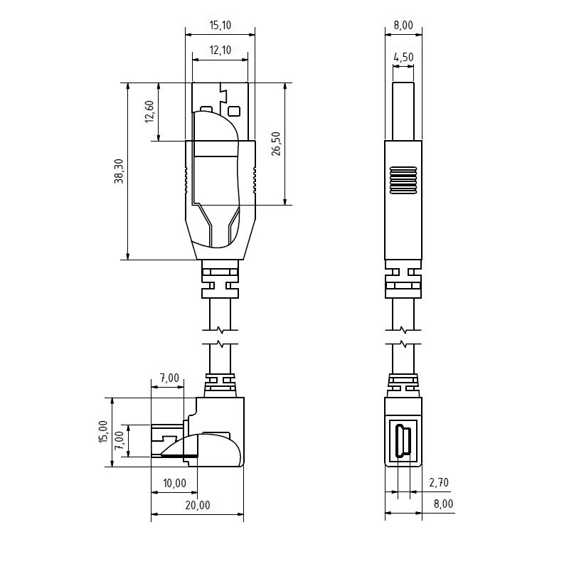 - CONNECTEUR 1 : USB 2.0 de type Mini-B mâle coudée à 90° DROITE (vers le périphérique / downstream)