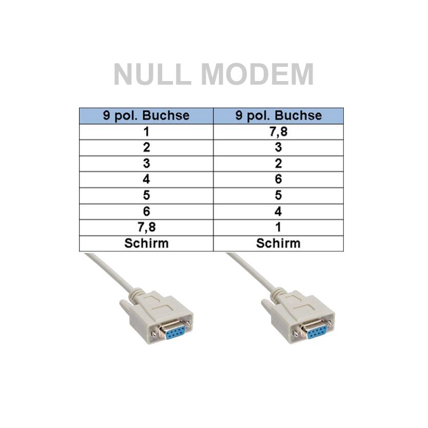 Câble Null Modem (croisé), 10m, DB9 femelle vers DB9 femelle (DSub9f), série/RS232, connexion: 1-7+8, 2-3, 3-2, 4-6, 5-5, 6-4, 7+8-1, shell-shell, couleur: gris