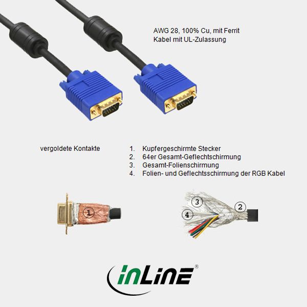 Câble S-VGA 2m, 2x HD-DB15 mâle, qualité PREMIUM-plus pour les applications industrielles, 2x noyaux de ferrite, 4x blindage, contacts plaqués or, noir avec des connecteurs bleu (PC-99)