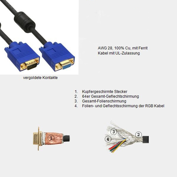 Câble S-VGA 2m, HD-DB15 mâle/femelle, qualité PREMIUM-plus pour les applications industrielles, 2x noyaux de ferrite, 4x blindage, contacts plaqués or, noir avec des connecteurs bleu (PC-99)