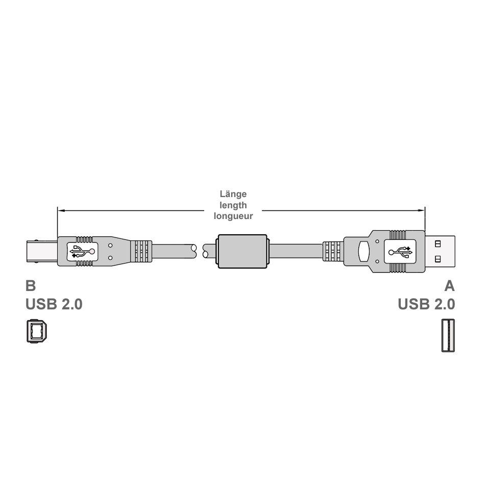 Câble USB "protection" avec noyau de ferrite, 5m, USB A mâle / USB B mâle, USB 2.0, parasurtenseur intégré à la prise A (protection contre les perturbations lors de la transmission des données)