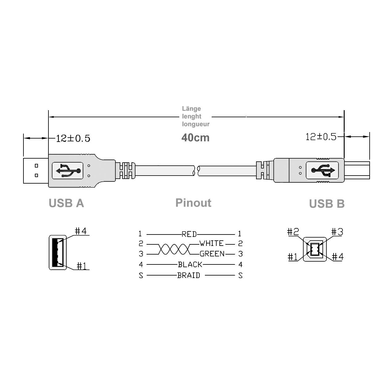 Câble USB, très court, longueur totale 40cm (2x prise 5cm + câble 30cm), Hi-Speed USB 2.0 (cordon de haute qualité 28AWG1P / 24AWG2C), connectique: USB à 4 broches type A mâle - USB à 4 broches type B mâle, couleur: argent (transparent)
