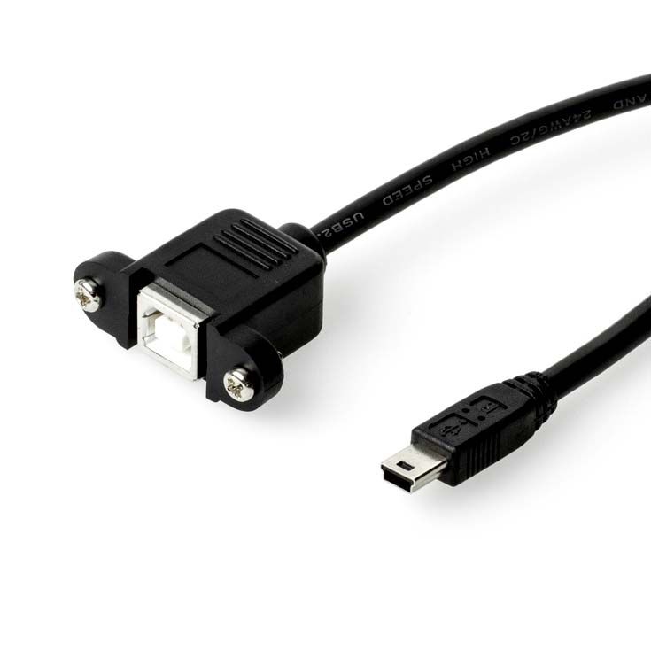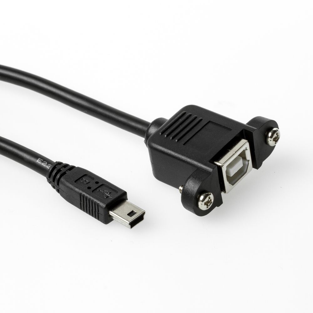 Câble USB 2.0 pour MONTAGE SUR PANNEAU: USB 2.0 B femelle (avec 2 vis pré-montées) vers USB 2.0 Mini B mâle, haute qualité 28AWG1P / 24AWG2C (CU), longueur 1m