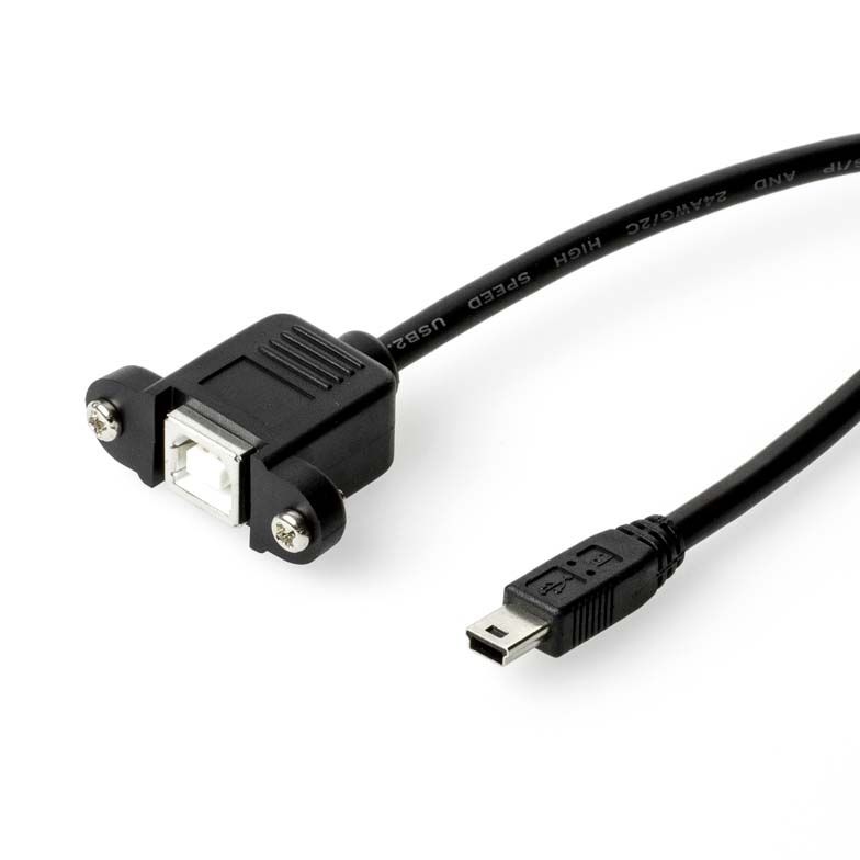 Câble USB 2.0 pour MONTAGE SUR PANNEAU: USB 2.0 B femelle (avec 2 vis pré-montées) vers USB 2.0 Mini B mâle, haute qualité 28AWG1P / 24AWG2C (CU), longueur 2m