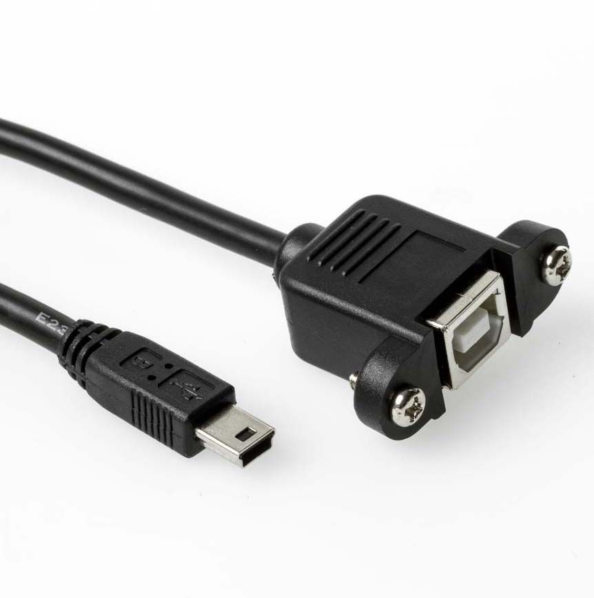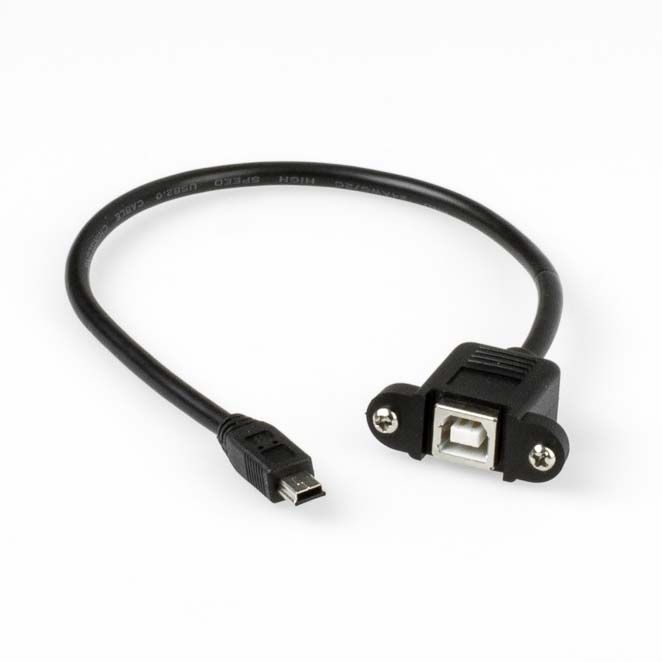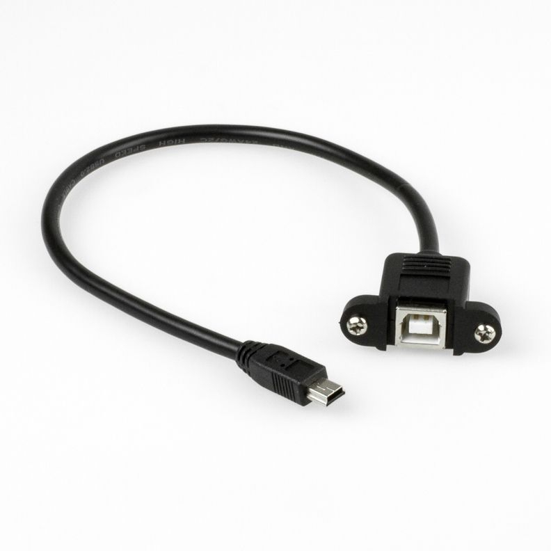 Câble USB 2.0 pour MONTAGE SUR PANNEAU: USB 2.0 B femelle (avec 2 vis pré-montées) vers USB 2.0 Mini B mâle, haute qualité 28AWG1P / 24AWG2C (CU), longueur 30cm