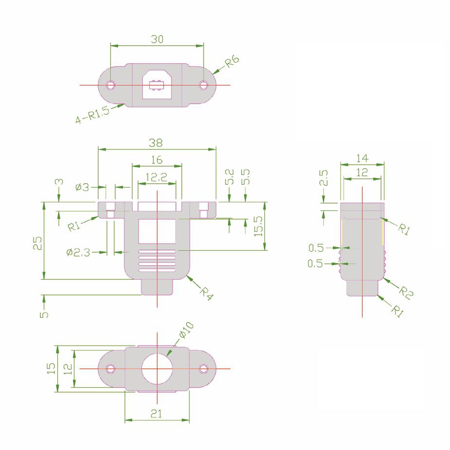 - Connexion 1 : USB 2.0 B femelle à visser (avec 2 écrous UNC 4-40 encastrés)