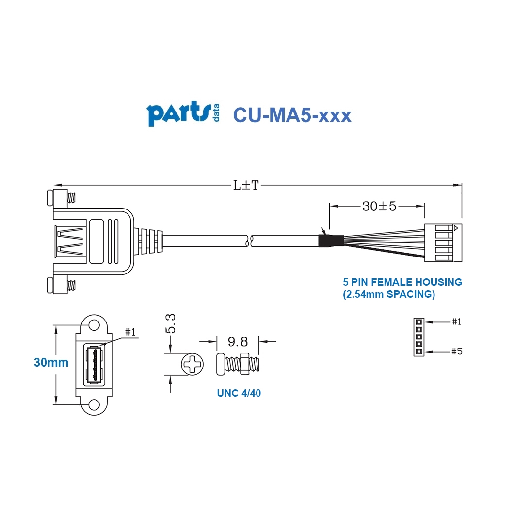 Câble USB 2.0 à montage sur panneau A femelle 2 vis vers 5 broches 20cm