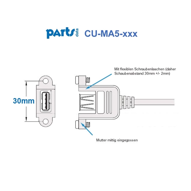- Connexion 1 : USB 2.0 A femelle à visser (écrous encastrés sur le côté)