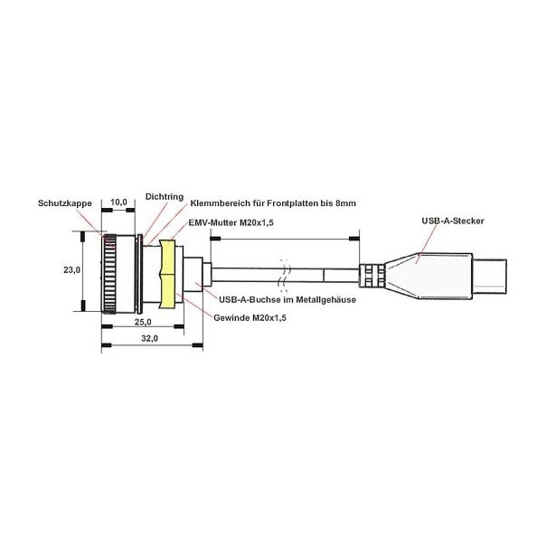 Câble USB 2.0 pour montage sur panneau avec capuchon à vis, étanchéité à l'humidité et à la poussière (IP67), support de capuchon interne (câble fin), USB type A femelle (boîtier métallique) vers USB type mâle, compatible USB 2.0, longueur 50cm