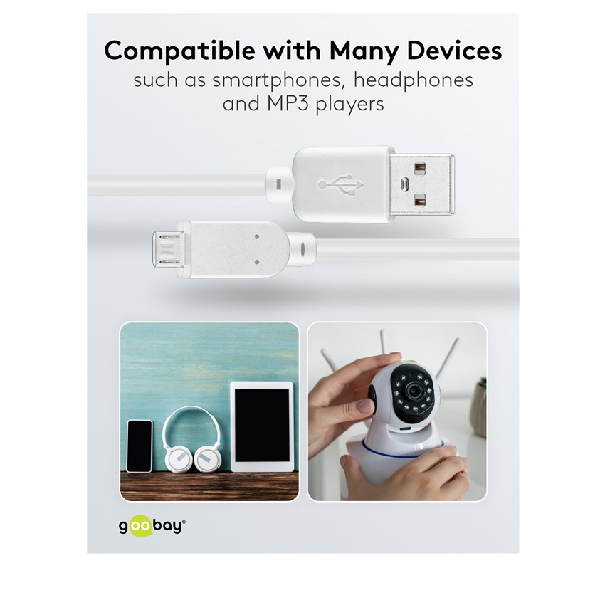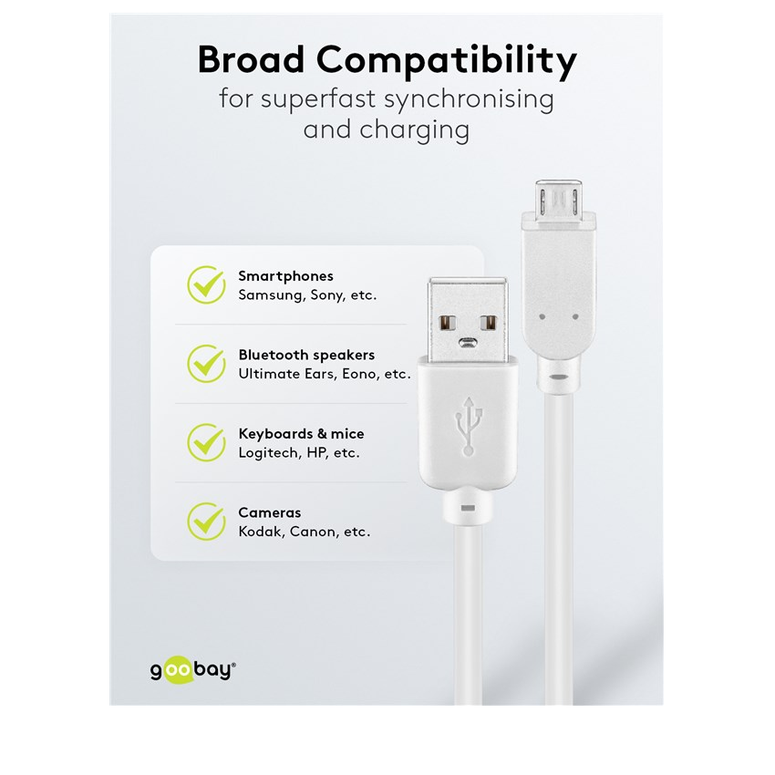 Câble USB 2.0 MICRO, USB A mâle vers USB Micro B mâle, 60cm, blanc, p. ex. câble pour téléphones mobile, smartphones