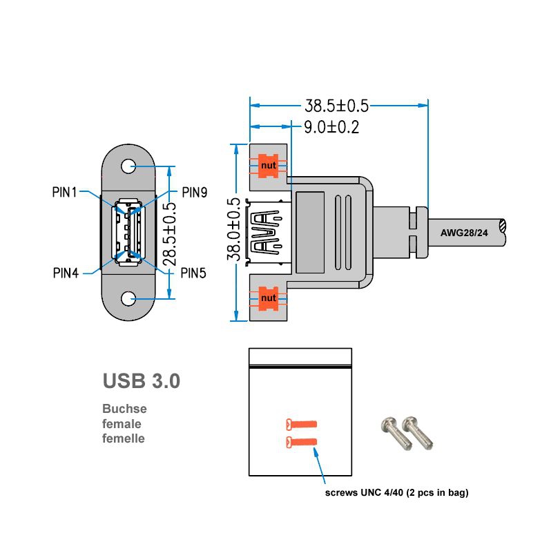 Câble USB 3.0 à visser RALLONGE DE MONTAGE Af/Am 1m (distance vis 28.5mm)