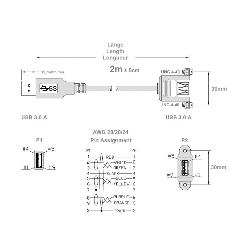 Câble USB 3.0 à visser RALLONGE DE MONTAGE Af/Am 2m (distance des vis 30mm)