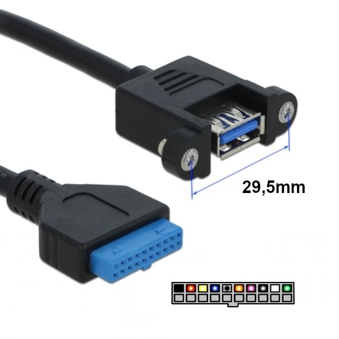 Câble USB 3.0 à visser / rallonge de montage, 50cm, prise A femelle (2 vis) vers prise carte mère (20 broches), USB 3.0 Super Speed, vis incluses, distance des vis: 29.5mm