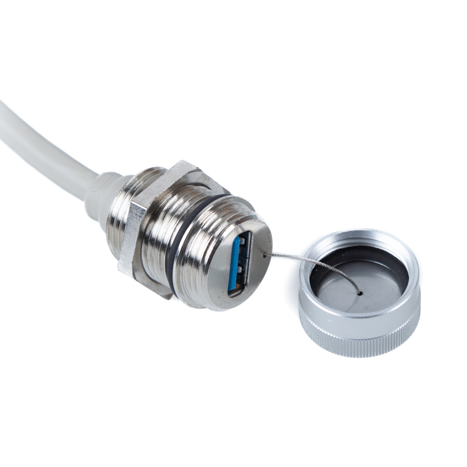 Câble USB 3.0 pour montage sur panneau : A femelle à visser avec capuchon à visser (protection IP67 contre la poussière et l'humidité) vers A mâle, capuchon avec câble de retenue interne, version métallique, qualité supérieure, 50cm