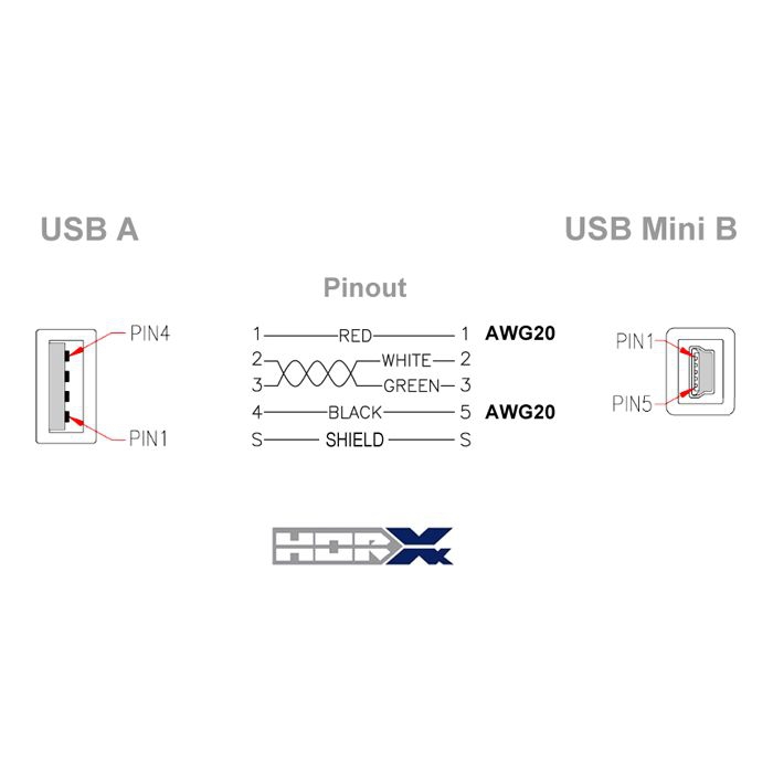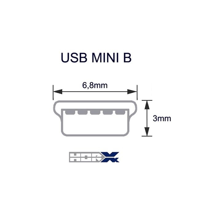 - petit connecteur USB 2.0 Mini B mâle, 5 broches (en aval/vers le dispositif USB)