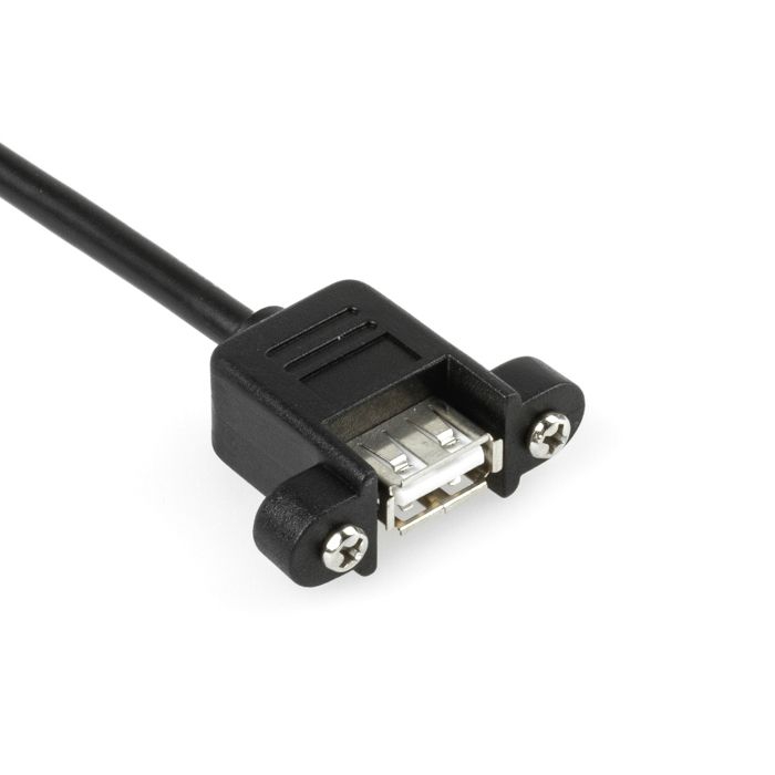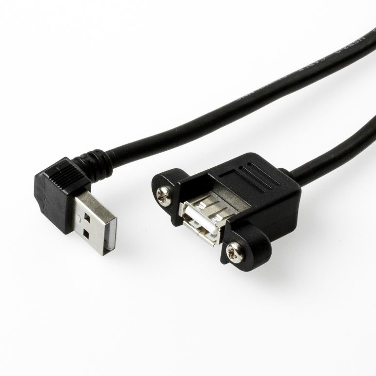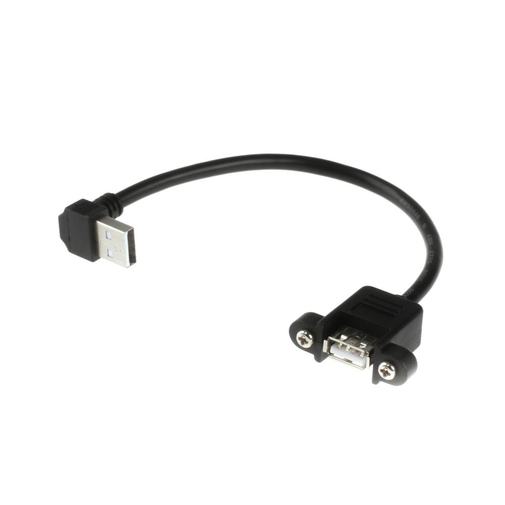 Câble USB à visser / rallonge de montage, 20cm, prise USB A femelle (2 vis) vers prise USB A mâle A coudée 90° VERS LE BAS, Hi-Speed USB 2.0 (haute qualité 28AWG1P / 24AWG2C), noir