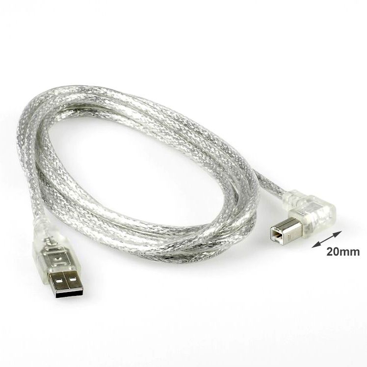 Câble USB avec connecteur B coudé 90° À DROITE, 2m, connectique: prise USB type A mâle (pas coudée) - prise USB type B mâle (coudée), Hi-Speed USB 2.0 (haute qualité 28AWG1P / 24AWG2C), couleur: argent (transparente)
