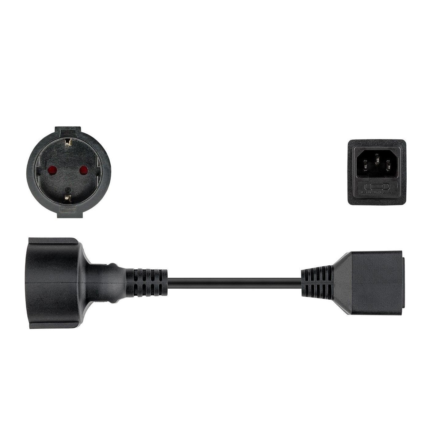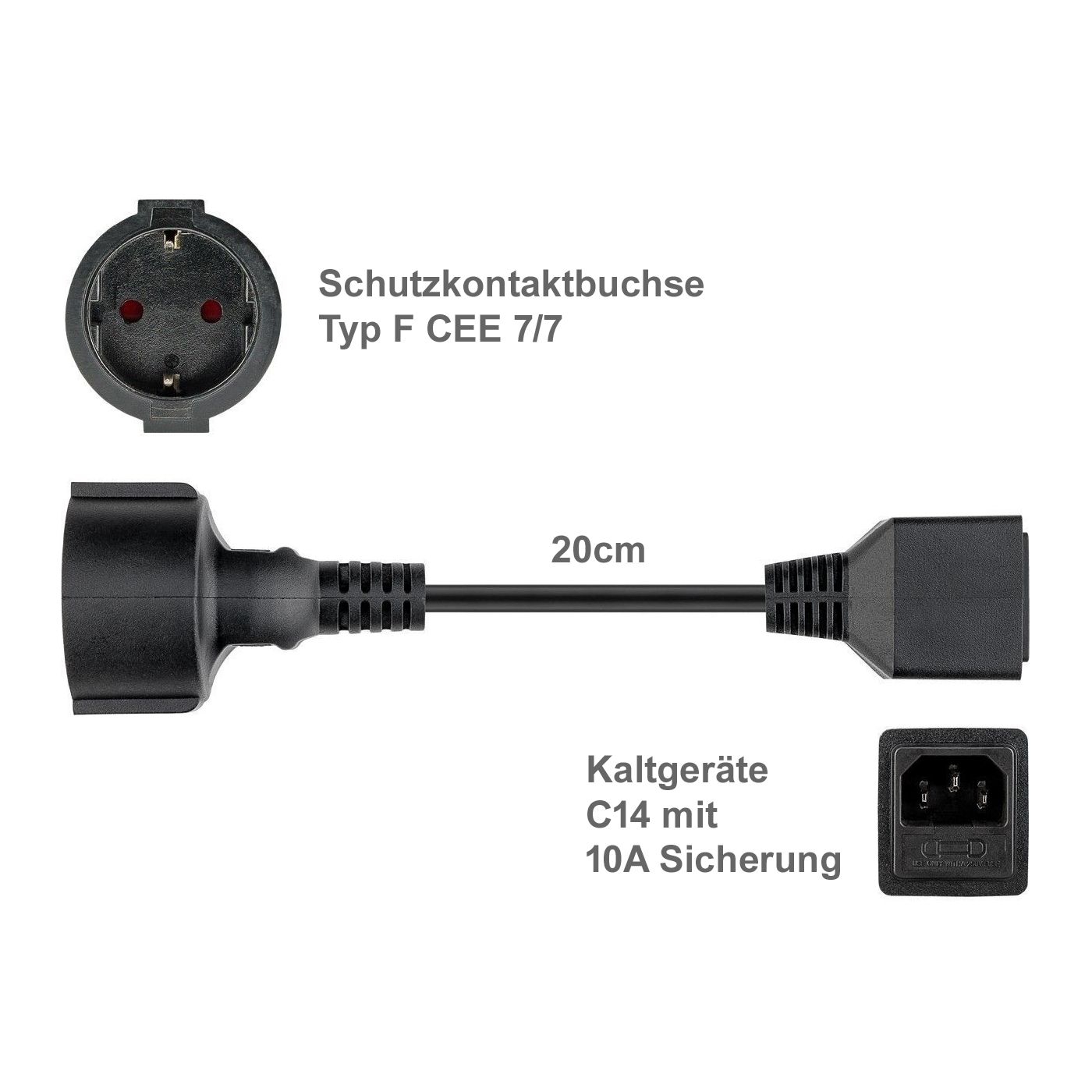 Câble adaptateur court : fiche IEC C14 (avec fusible 10A intégré) vers prise de courant (type F, CEE 7/7), longueur env. 20 cm.