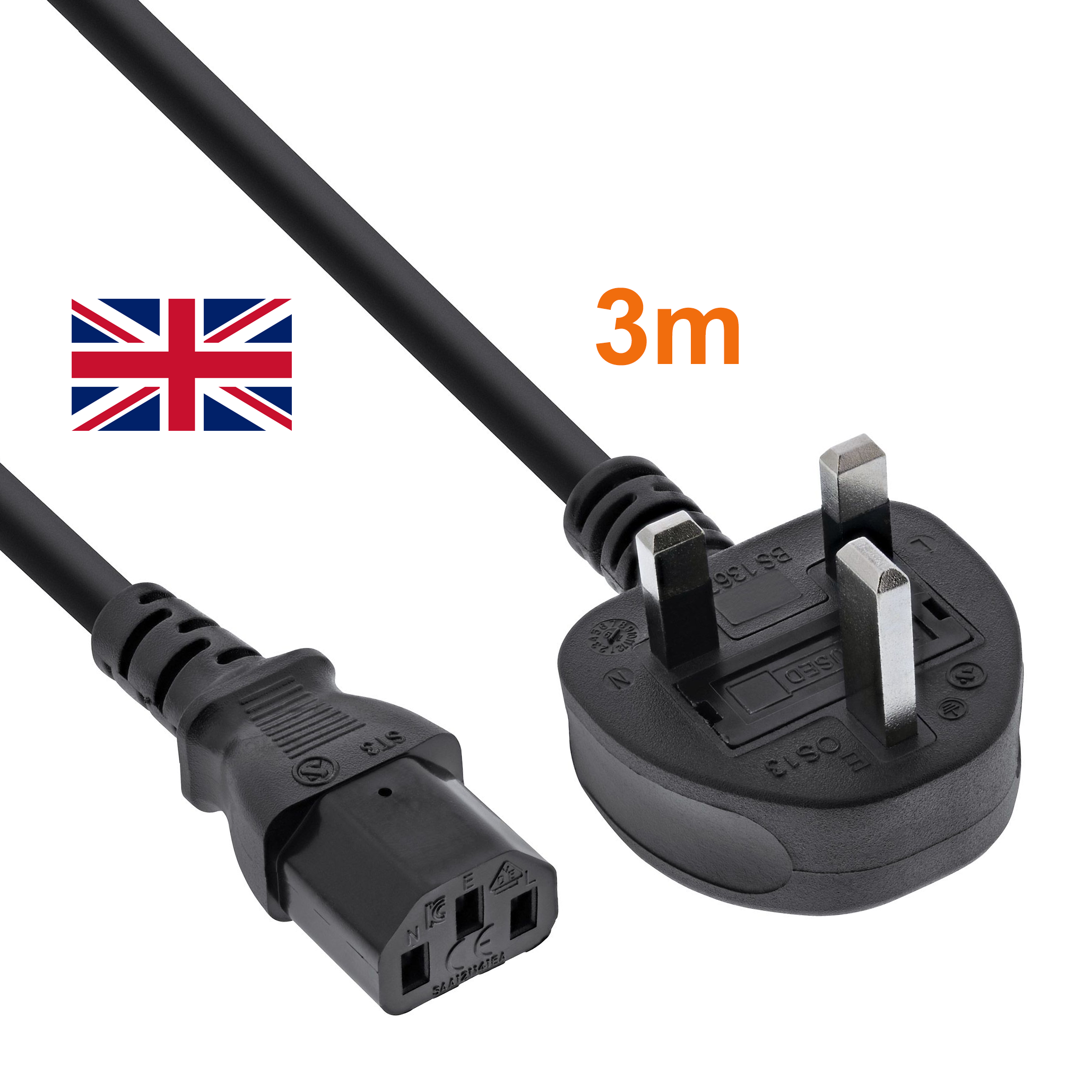 Câble d'alimentation secteur externe pour PC, 3m, pour Angleterre/Irlande, prise Angleterre (coudé, 2 pôles + terre) avec fusible 10 Amp. - IEC femelle (type "Informatique"), 3 x 1mm², noir