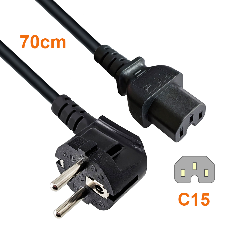 Câble secteur CEE 7/7 90° sur fiche pour appareil chaud C15, 1mm², VDE, noir, longueur 70cm