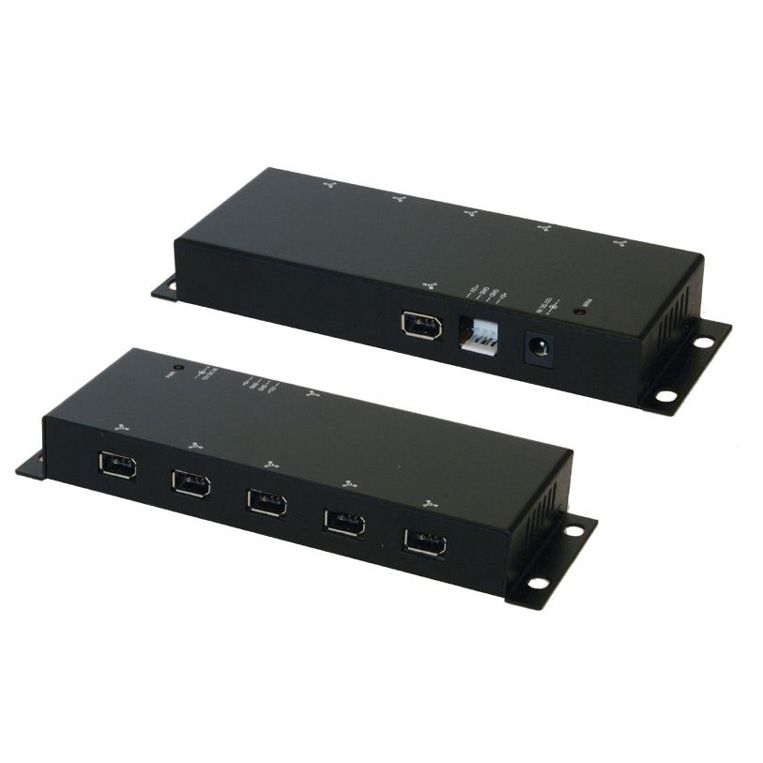 Concentrateur (HUB) Firewire 400 avec 6 ports (1 in / 5 out), version industrielle (boîtier métallique noir), compatible IEEE1394a, avec alimentation externe 12V et câble FireWire 6/6, noir