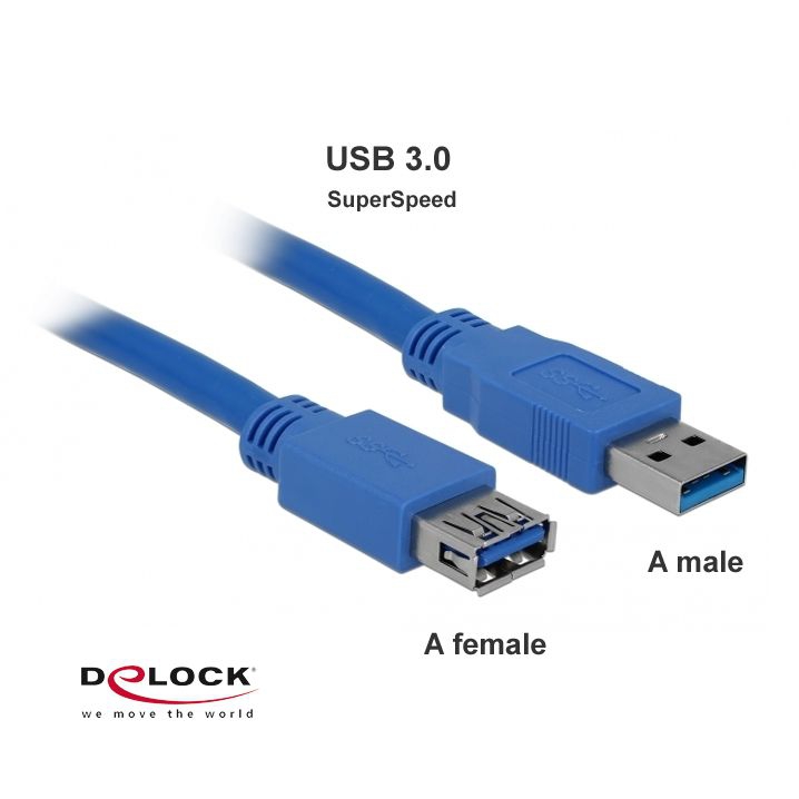 Câble rallonge USB 3.0, 2m, Super-Speed (max. 5Gbps), connectique: fiche USB3 A mâle - fiche USB3 A femelle, cordon de haute qualité, couleur: bleue (Produit de marque DELOCK n° 82539)