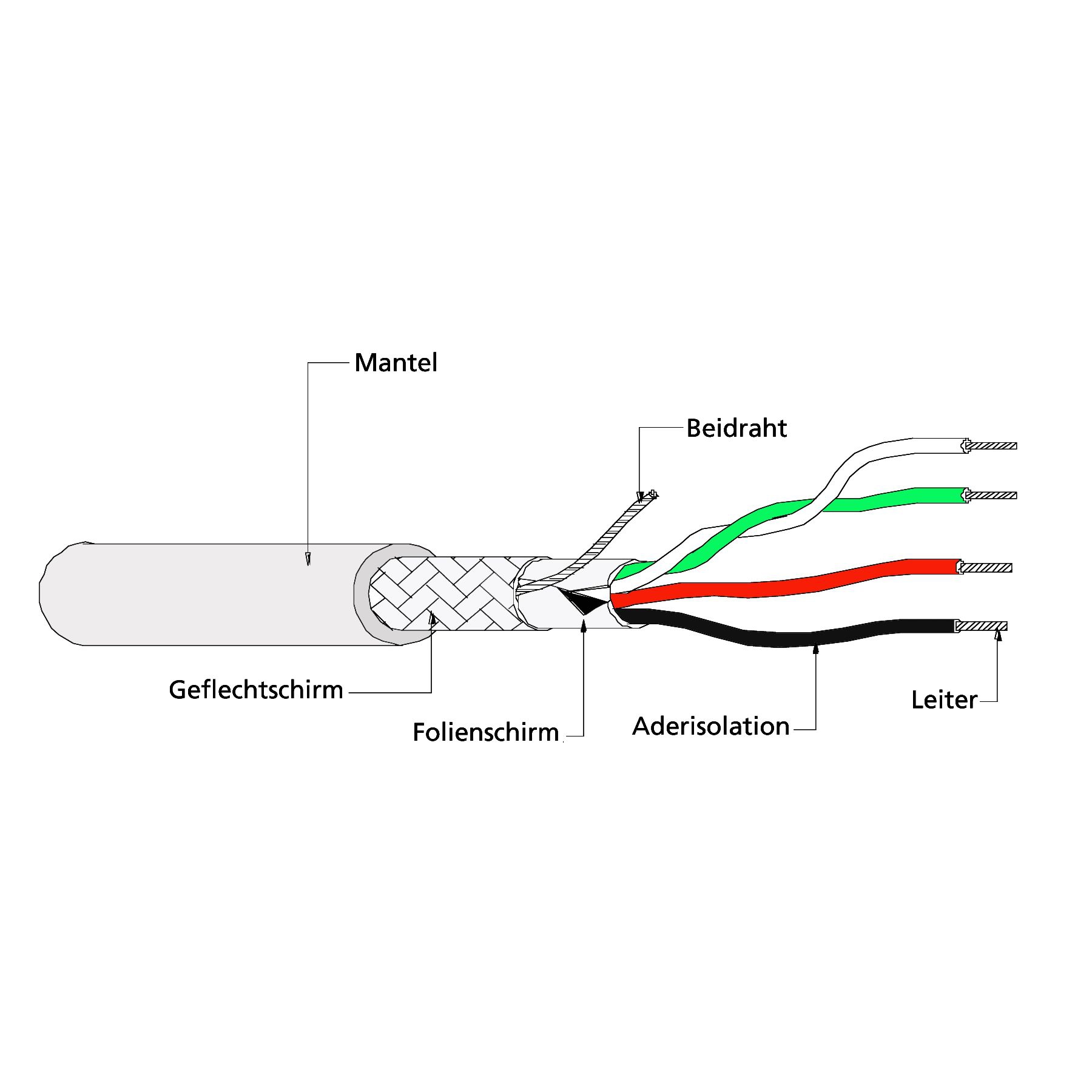 Touret de câble USB 2.0, 100m, norme de transmission USB: AWG28/1P (câble à paires "twisted pair", transfert de données) AWG24/2C (connexion 5V), 2x blindé, compatible USB 2.0, diamètre 4,5mm, couleur: gris