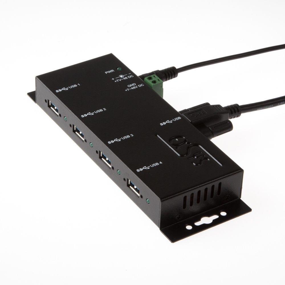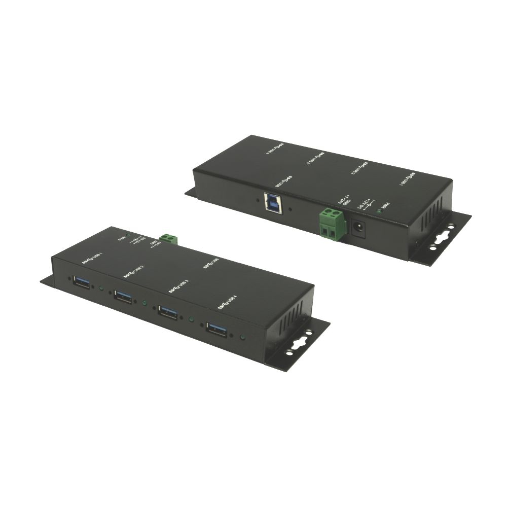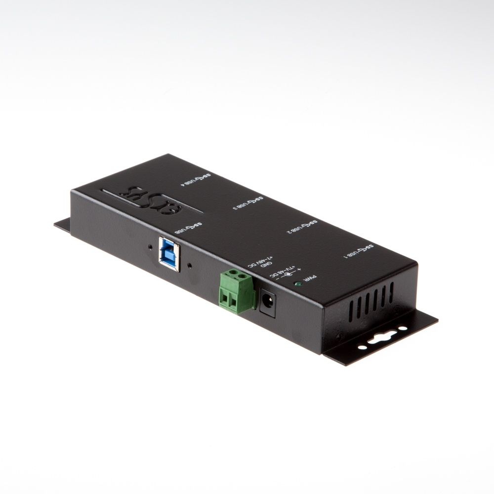 The rugged and industrial grade EX-1183HMVS-2 is a USB 3.2 Gen 1 metal hub for up to four end devices. The hub provides four screwable USB 3.2 Gen 1 downstream ports with 15KV ESD surge protection. It is possible to connect up to four external USB peripherals to one USB 3.2 Gen 1 port from notebook, desktop computer or server in 19" rack. It supports SuperSpeed USB 3.2 Gen 1 data transfer rate of up to 5Gbps and is backward compatible to USB 1.1. The included USB 3.2 Gen 1 cable can be attached to the EX-1183HMVS-2 with thumbscrews without a screwdriver. The EX-1183HMVS-2 can be powered via a DC jack, as well as a two wire terminal block connector (+7V to +48V). The HUB meets the special requirements of industrial applications.