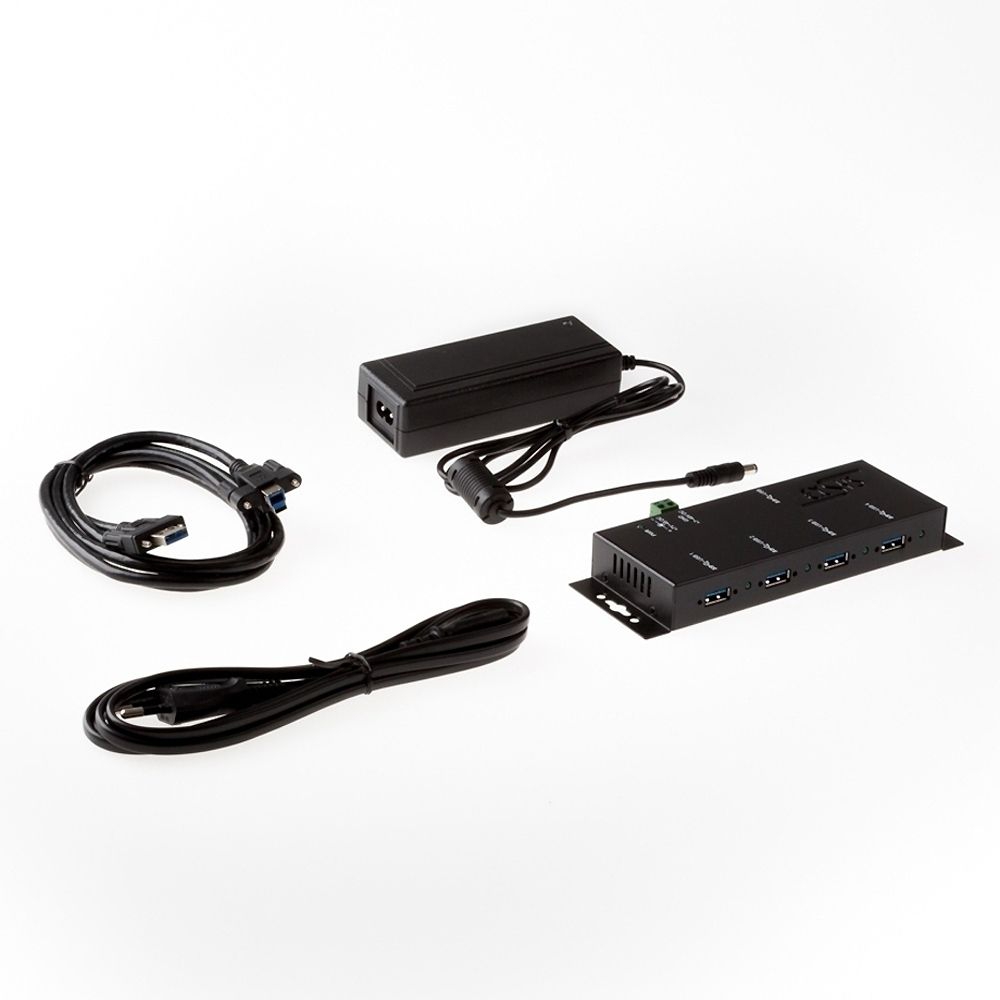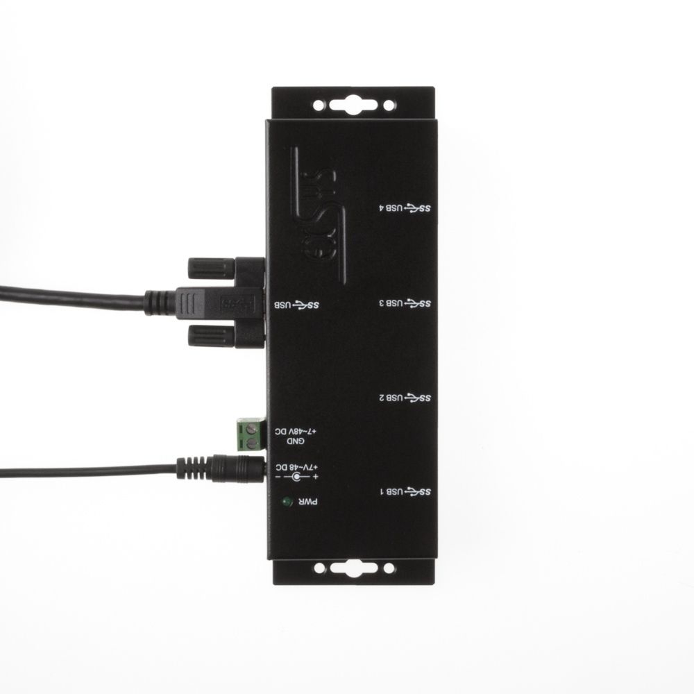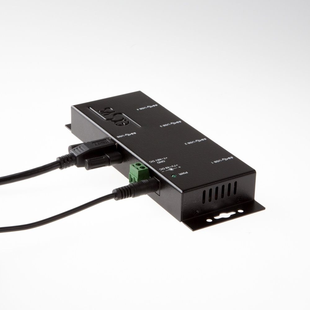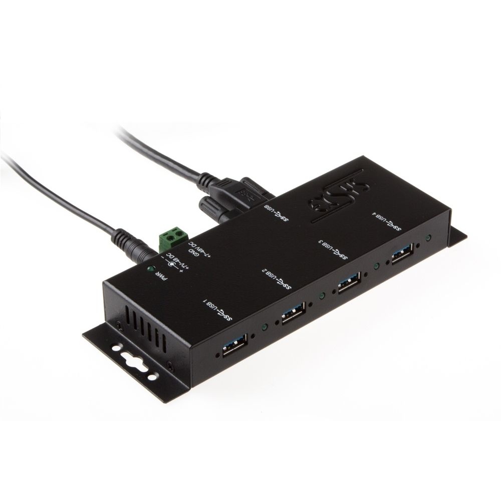 The rugged and industrial grade EX-1183HMVS-2 is a USB 3.2 Gen 1 metal hub for up to four end devices. The hub provides four screwable USB 3.2 Gen 1 downstream ports with 15KV ESD surge protection. It is possible to connect up to four external USB peripherals to one USB 3.2 Gen 1 port from notebook, desktop computer or server in 19" rack. It supports SuperSpeed USB 3.2 Gen 1 data transfer rate of up to 5Gbps and is backward compatible to USB 1.1. The included USB 3.2 Gen 1 cable can be attached to the EX-1183HMVS-2 with thumbscrews without a screwdriver. The EX-1183HMVS-2 can be powered via a DC jack, as well as a two wire terminal block connector (+7V to +48V). The HUB meets the special requirements of industrial applications.