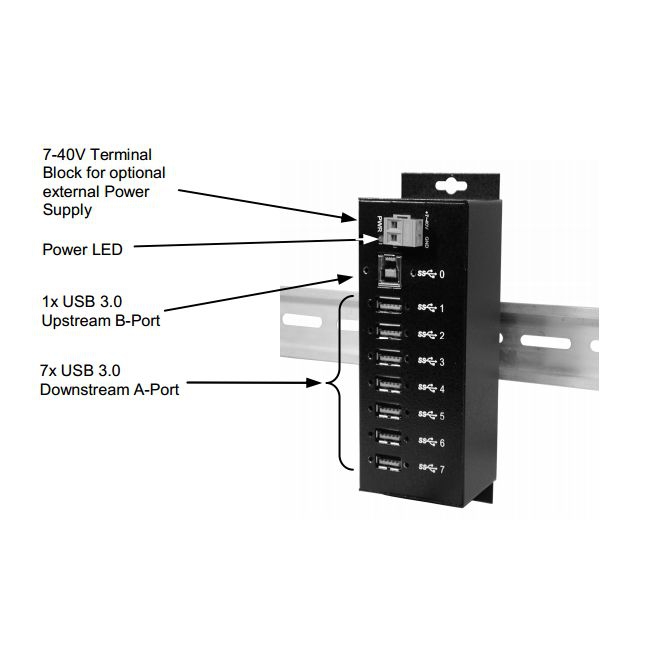 USB 3.0 HUB concentrateur avec 7 ports, version DIN RAIL, 1x B femelle (entrée) + 7x A femelle (sorties), boîtier métallique, avec protection de surintensité, sans alimentation électrique, couleur: noir, modèle: EXSYS EX-1187HMVS