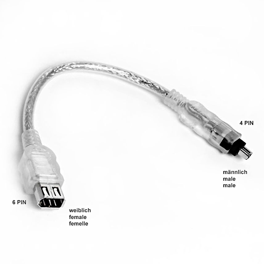 Adaptateur FireWire, connectique: FireWire à 6 broches (femelle) vers FireWire à 4 broches (mâle), câble très court, compatibilité: IEEE1394a, Firewire 400, S400, i.Link, DV, couleur: argent / transparente