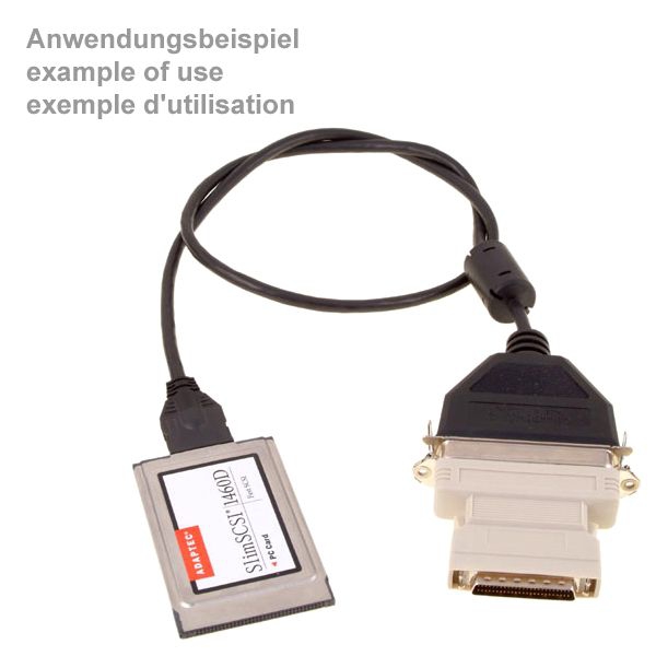 L'adaptateur SCSI proposé ici permet d'adapter un câble SCSI standard doté d'un grand connecteur SCSI à 50 broches à un connecteur HP-DSub-50 mâle (avec broches de contact). Les connecteurs HP-DSub-50 sont parfois également appelés connecteurs SCSI-II ou Mini-DSub-50. Les prises HP-DSub-50 se trouvent, par exemple, sur de nombreux contrôleurs SCSI-II, scanners ou boîtiers de disques durs SCSI externes.