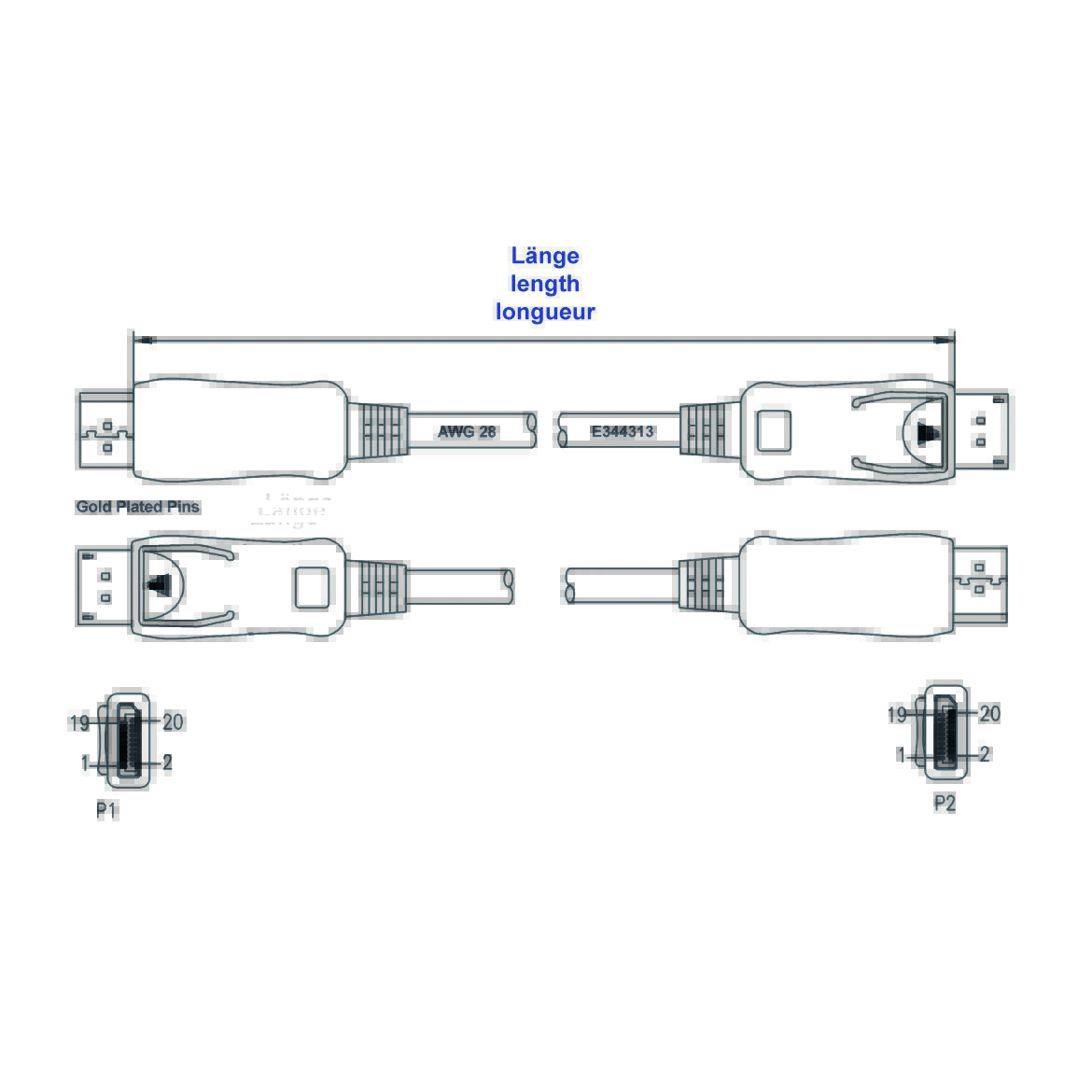- des deux côtés, connecteur DisplayPort™ (mâle, 20 pôles) avec fonction de verrouillage