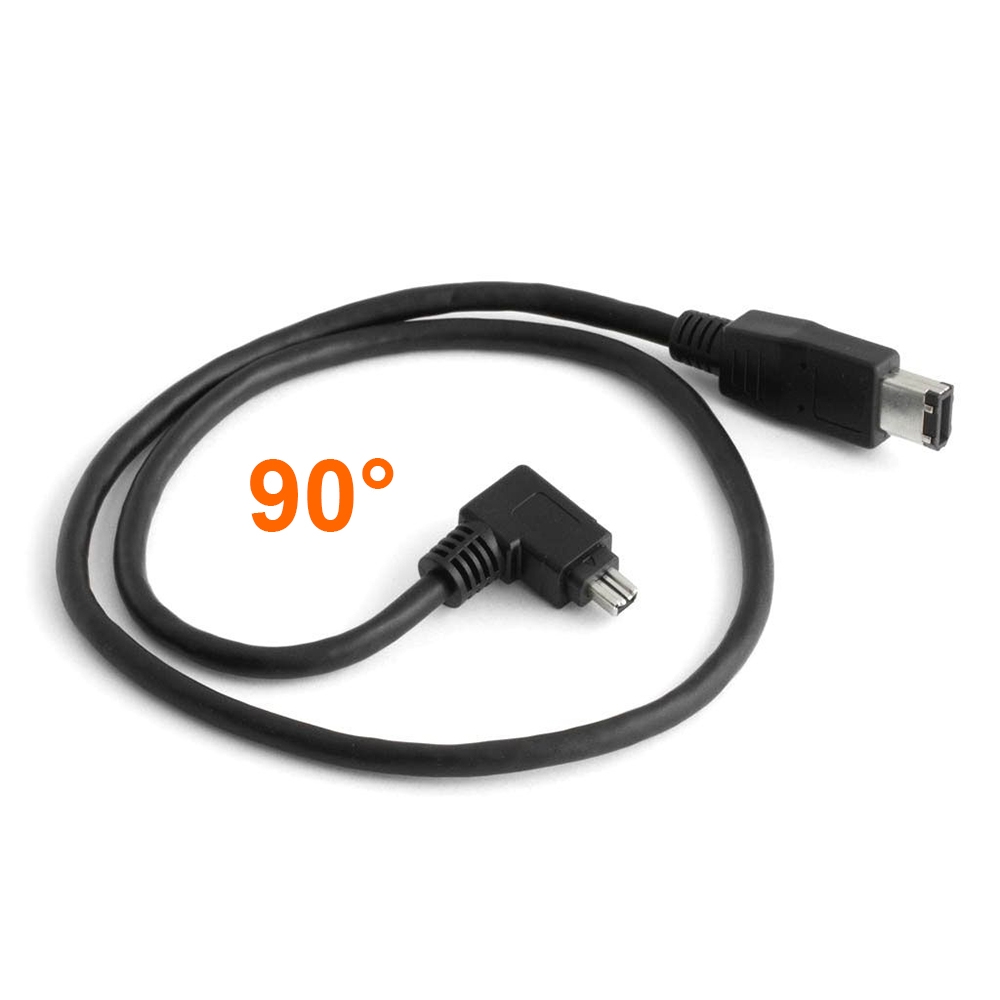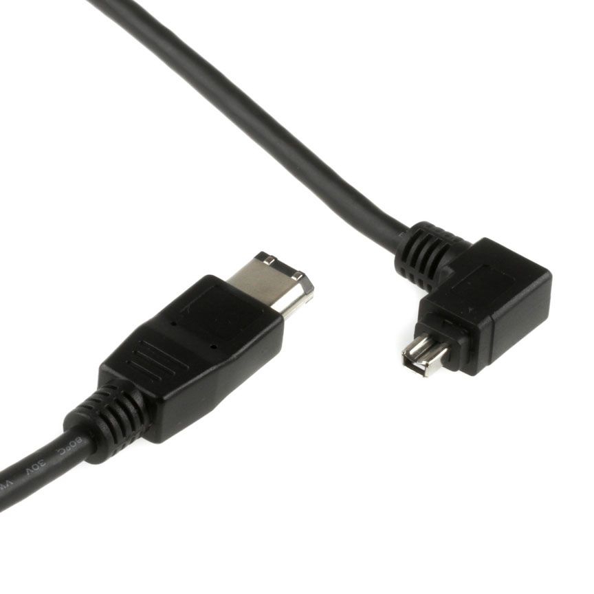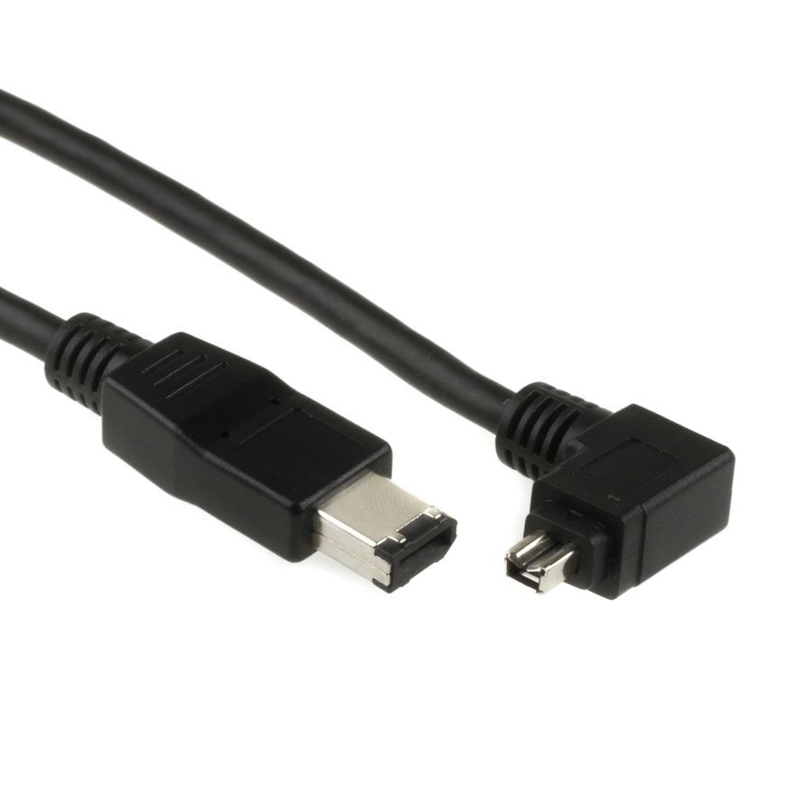 Câble FireWire 4/6 coudé, très court 60cm, connectique: prise FireWire 4 broches mâle (coudée 90°) vers prise FireWire 6 broches mâle (pas coudée), 400 MBit/s, compatibilité: Firewire 400, IEEE-1394a, S400, i.Link, DV, couleur: noir