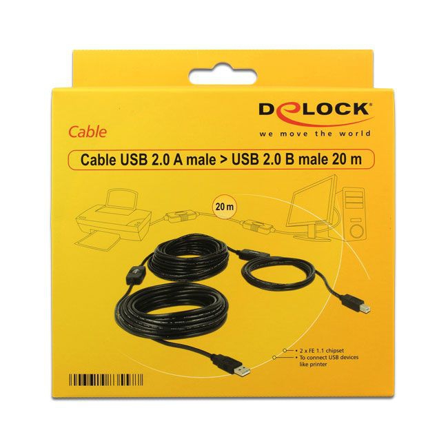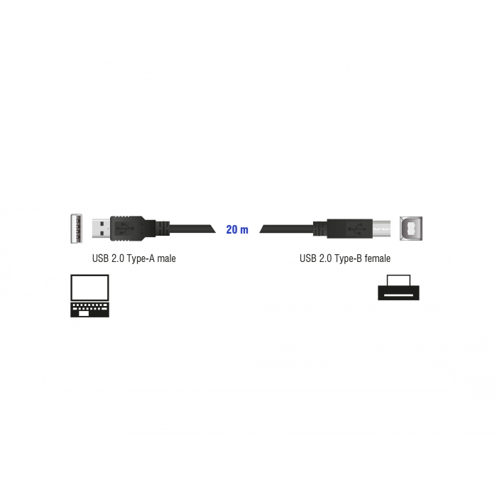 Câble USB active, 20 mètres, cordon de haute qualité avec 2 amplificateurs/répéteurs, Hi-Speed USB 2.0, connectique: USB A à 4 broches (mâle) vers USB B à 4 broches (mâle), couleur: noir