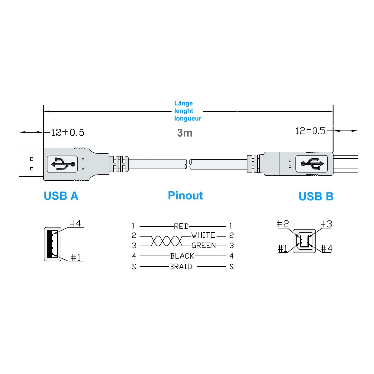 Câble USB, longueur 3 mètres, Hi-Speed USB 2.0 (cordon de haute qualité 28AWG1P / 24AWG2C), connectique: USB à 4 broches type A mâle - USB à 4 broches type B mâle, couleur: argent (transparent)