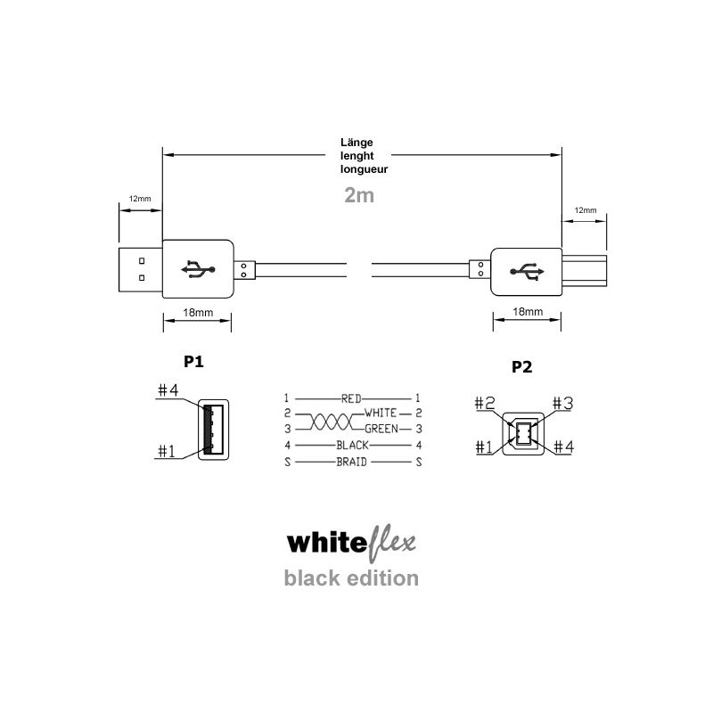 Câble USB WHITEFLEX Black Edition, 2m, noir, pour Mac/PC, cordon très flexible, diamètre seulement 3mm, Hi-Speed USB 2.0, connectique: USB à 4 broches type A (mâle) - USB à 4 broches type B (mâle)