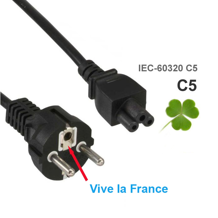 Câble en trèfle pour alimentation de Pc portable, 1.8m, version pour Europe continentale (France, Allemagne...), 3G x 0,75mm², noir, câble avec IEC-60320 C5