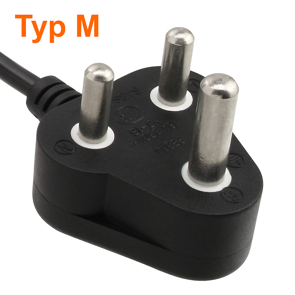 - fiche sud-africaine avec 3 broches de contact (2x env. 7mm, 1x env. 8,7mm de diamètre)