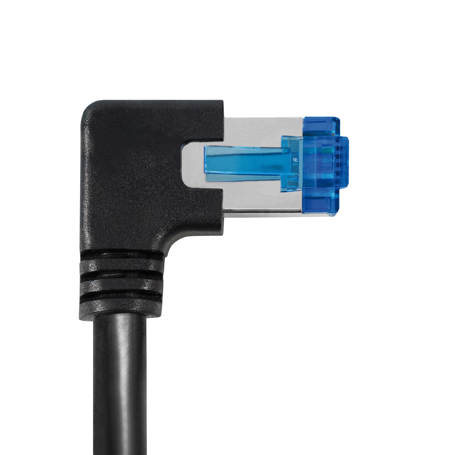 Câble réseau Cat.6A, 1x prise RJ45 coudée à 90° VERS LA DROITE, 1x prise RJ45 droite, AWG26 (CU), S/FTP (PIMF), noir, 0.5m