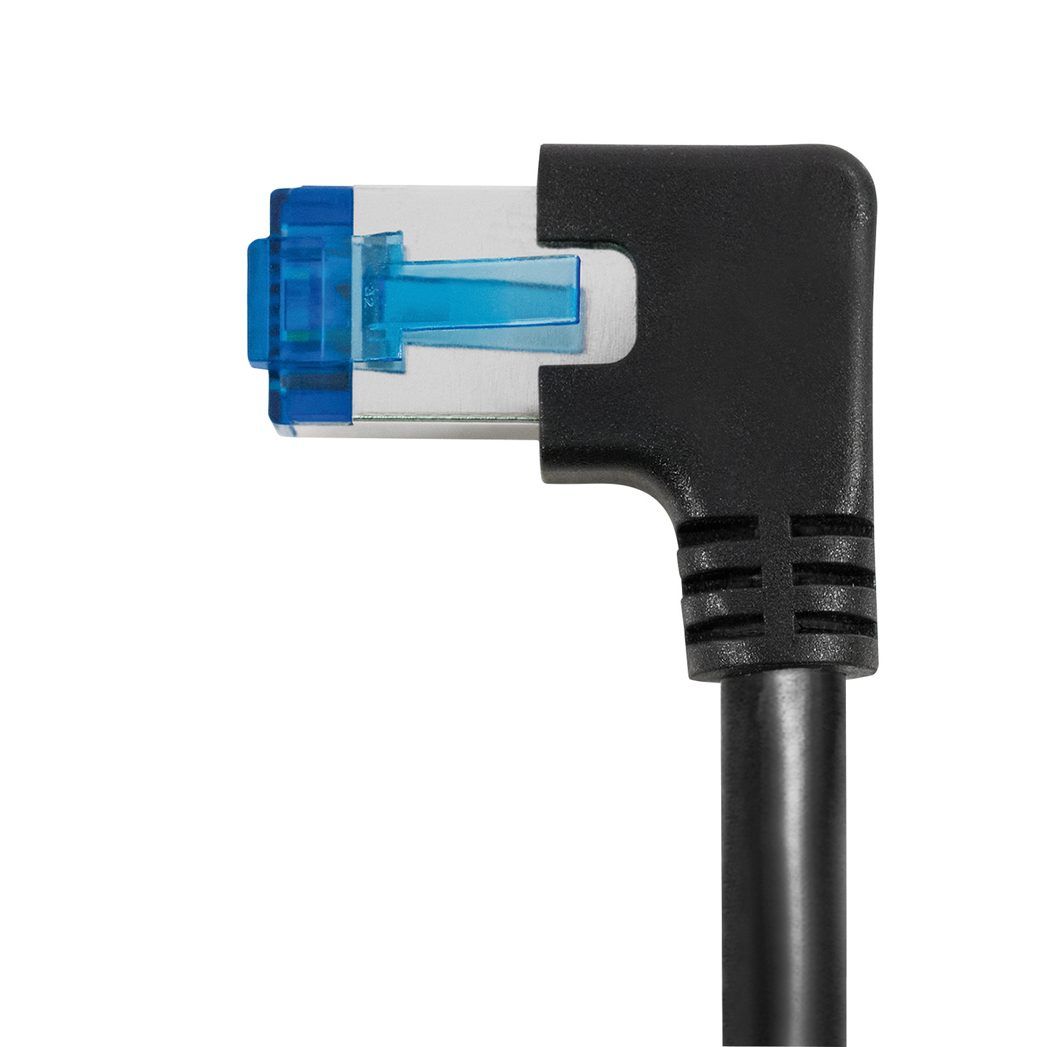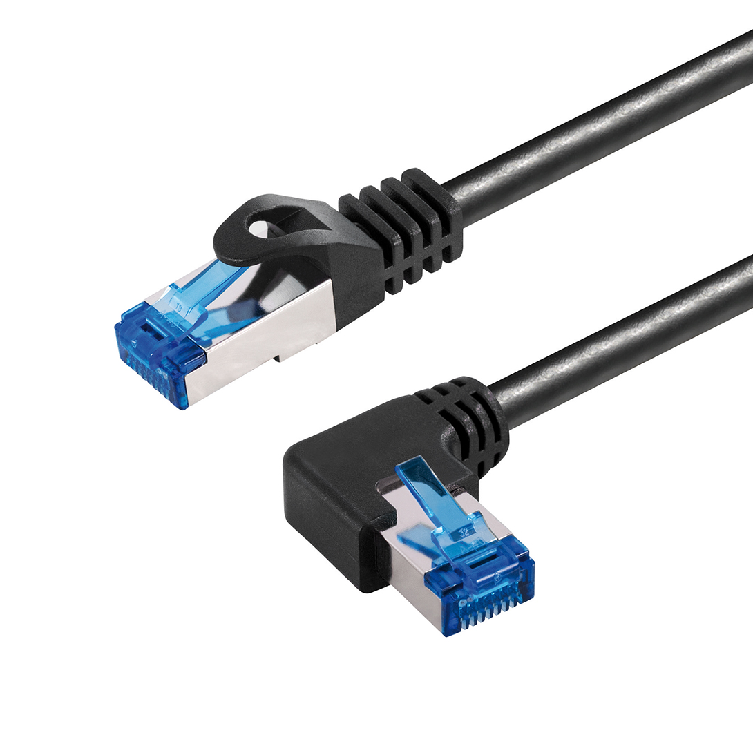 Câble réseau Cat.6A, 1x prise RJ45 coudée à 90° VERS LA GAUCHE, 1x prise RJ45 droite, AWG26 (CU), S/FTP (PIMF), noir, 1m