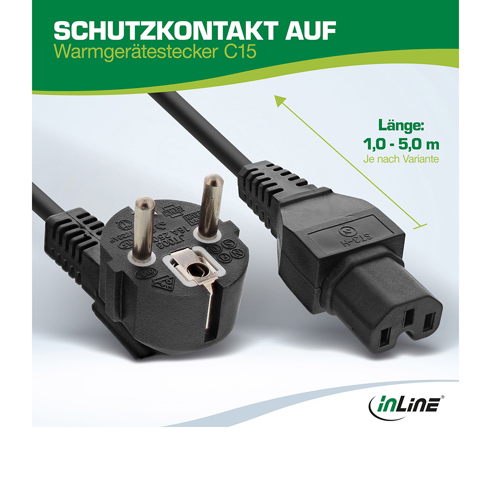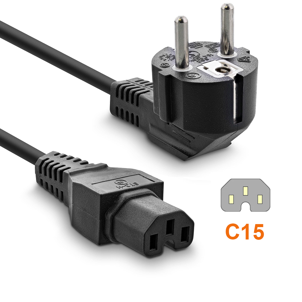 Câble secteur CEE 7/7 90° sur fiche pour appareil chaud C15, 1mm², VDE, noir, longueur 2m