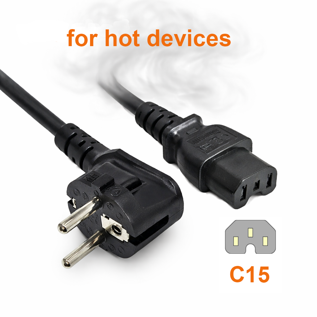 Câble secteur CEE 7/7 90° sur fiche pour appareil chaud C15, 1mm², VDE, noir, longueur 70cm