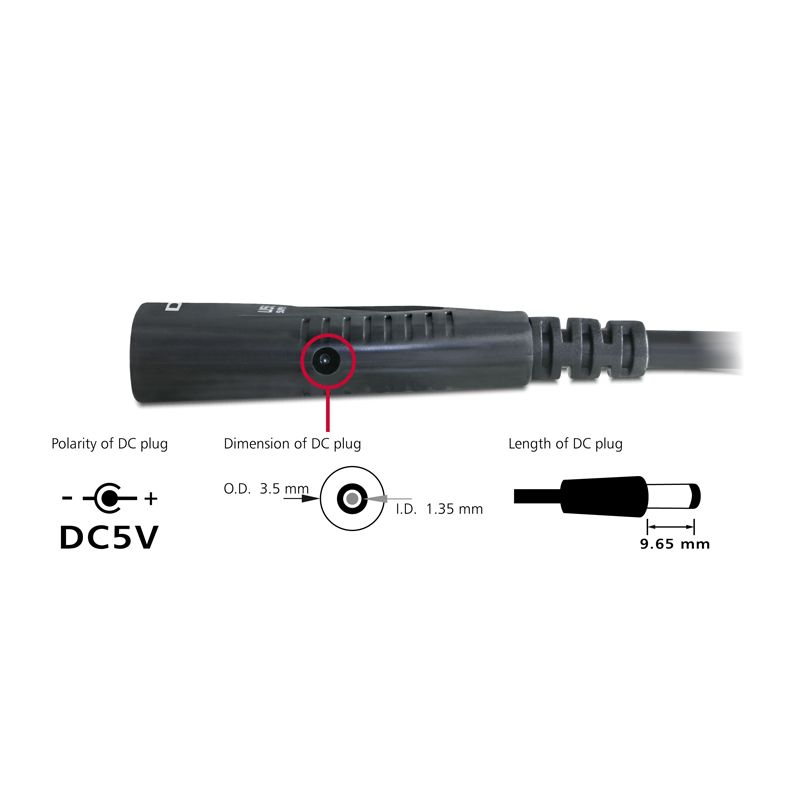 - avec connecteur DC pour alimentation supplémentaire (dimensions : intérieur 1,35mm, extérieur 3,5mm, longueur 9,65mm)