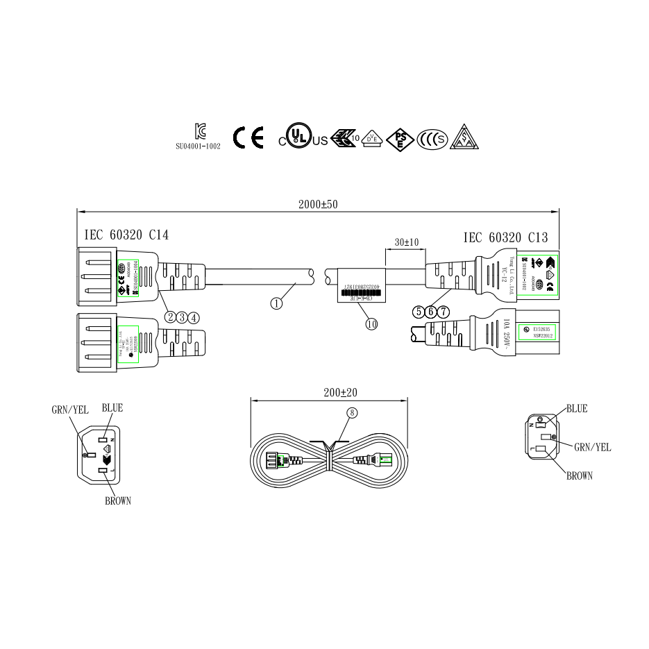 Rallonge d'alimentation secteur C13 vers C14, longueur 2m, utilisable internationale VDE ENEC 10/UL, PSE, SAA, CCC, KTL, 3 x 1mm², VDE, NF, DEMKO, NEMKO, FINKO, KEMA, CEBEC, OVE, IMQ, SEV, SAA